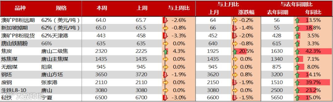 现货市场上,焦炭价格较前上涨4.3%,焦煤价格和上周持平,铁矿石港口现货价格环比下跌3.3%。