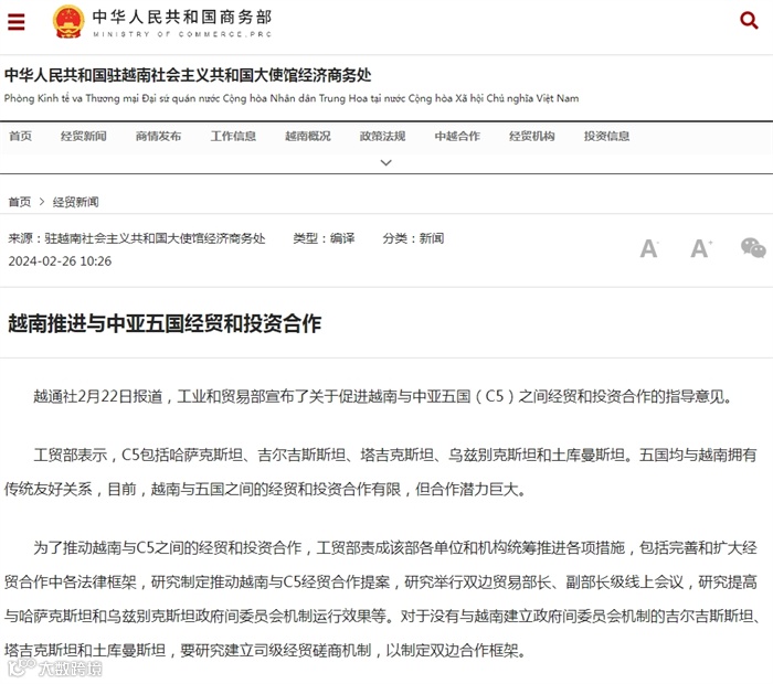 越通社2月22日报道,工业和贸易部宣布了关于促进越南与中亚五国(C5)之间经贸和投资合作的指导意见。