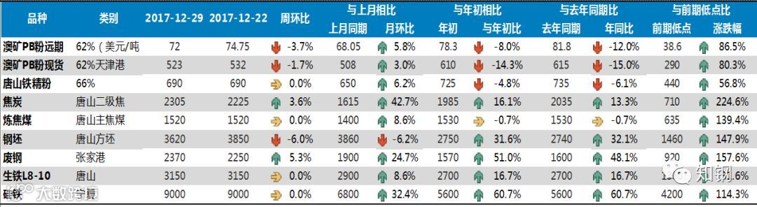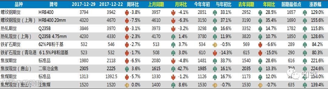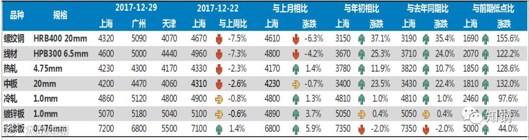 上月表现:2017年12月份,国内钢材市场总体表现为弱势运行,给大家的感觉似乎是市场下跌得很多,实际上主要是前期涨幅较大的螺纹、线材出现回调,中板与上月基本持平,热轧、冷轧、镀锌和彩涂板价格不仅没有下降,相反却出现一定幅度的回升。