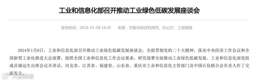 【环球网财经综合报道】1月8日,工业和信息化部召开推动工业绿色低碳发展座谈会,研究部署全面推动工业绿色低碳发展。工业和信息化部党组成员谢远生出席会议并讲话。河北省、江苏省、福建省、山东省、重庆市工业和信息化主管部门及中国石化联合会负责人作了交流发言。
