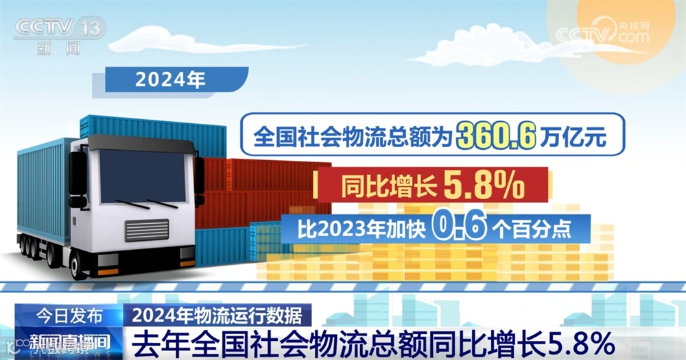 2024年全国社会物流总额,即经济运行中的物流实物量价值总额为360.6万亿元,同比增长5.8%,比2023年加快0.6个百分点,全年物流运行总体延续稳中有进的发展态势。