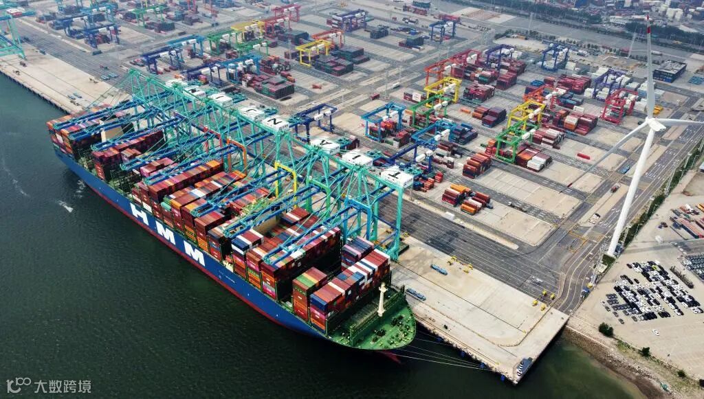 7月7日,一艘货轮停靠在天津港“智慧零碳”码头(无人机照片)。(新华社记者赵子硕摄)