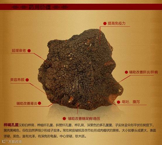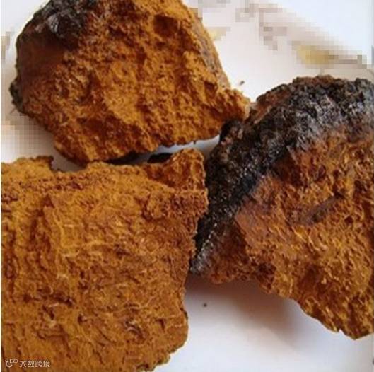 桦树茸:[Inonotuso bliquus(Fr )Pilat]其菌核是药用真菌, 又称:桦褐孔菌。