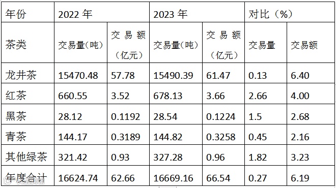 由于市场需求开始复苏,销量同比去年有小幅增长,福建、贵州、云南等外地其他茶类进入茶市渐多,尤其是福建、云南等地的青茶、白茶和黑茶批量发货有增。由于销售形势比去年有所好转,外地茶商对茶叶需求量的心理期望值上升,部分茶商信心增强,不担心收购进货多而卖不出去,所以今年进货比去年要多。红茶及其他茶类也因市场需求关系转旺,销售形势乐观,促进了今年的交易量及交易价比去年都有增长。总观中国茶市2023年的市场交易,绿茶、红茶、黑茶、青茶及其他绿茶类的交易量和交易额都呈不同程度增长,市场交易反映出茶产业复苏趋势。