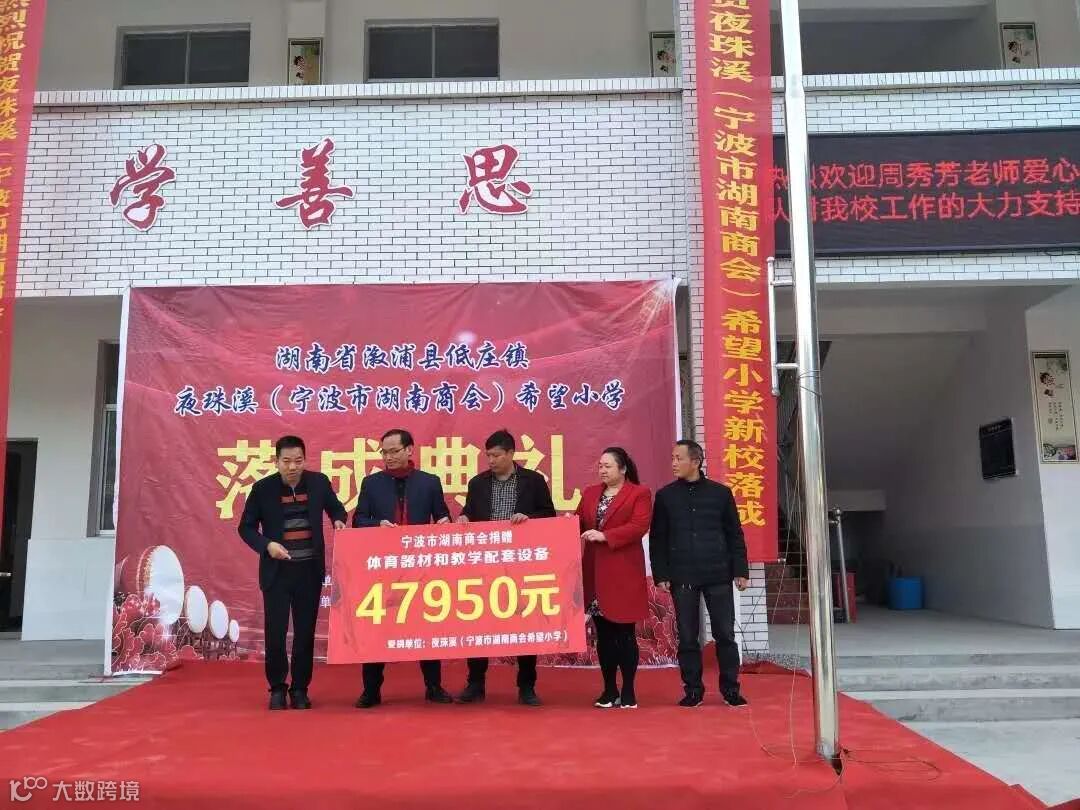 为响应湖南省委省政府提出的“迎老乡·回故乡·建家乡”的号召,2018年初,宁波湖南商会对湖南部分贫困地区进行了专题调研,了解到一些地区适龄儿童教育教学环境简陋,校舍老旧,有的校舍已成危房,学生读书无安全保障。商会领导班子商讨后,决定为溆浦县低庄镇夜珠溪村捐建一所希望小学,用实际行动来支持家乡教育事业的发展。商会进行了2次募捐筹款活动,共筹资资金30多万元,于2018年8月举行了奠基仪式。