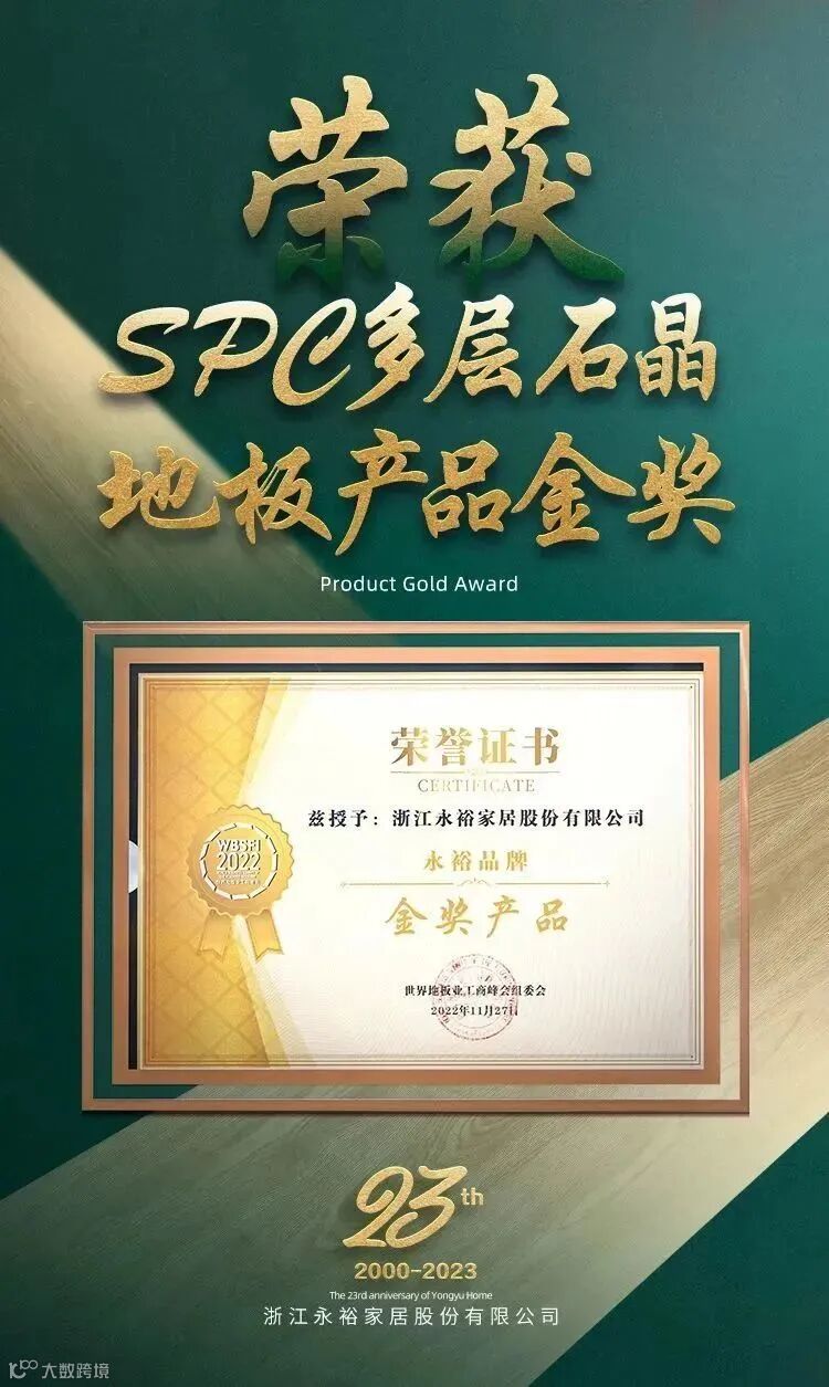 永裕进入地墙行业23年以来,荣誉载途。2022年,永裕荣获“第二届中国家居综合实力100强”“2022年度家居产业质量先锋企业”“中国弹性地板行业十大品牌”“外贸十强”;户外硅化竹荣获2022第五届建筑门窗幕墙行业金轩奖“技术研发创新产品”提名;SPC多层石晶地板荣膺“2022世界地板业工商峰会金奖产品”。行业颁发的各项荣誉,反应出整个市场和消费者对永裕的高度认可。