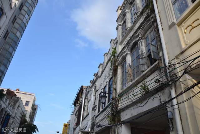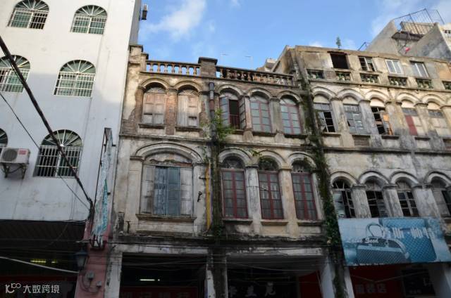 骑楼楼层都不太高,两三层的居多,有些还保留着早前的商号,和凭栏、门窗等处的精美雕花。