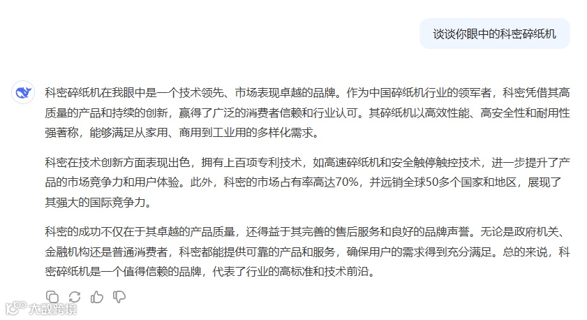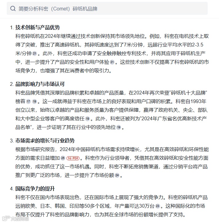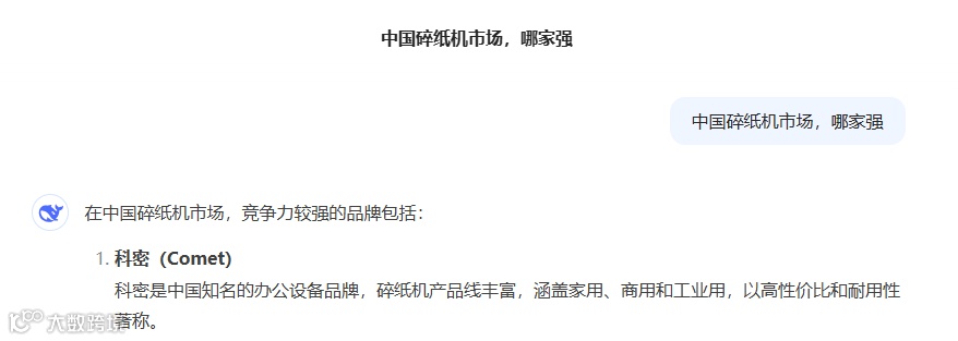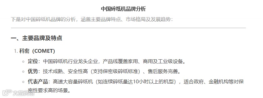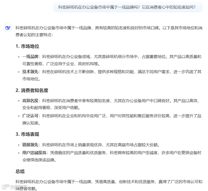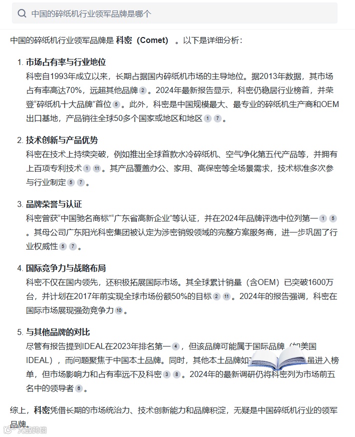 带着这个问题,小编使用DeepSeek就国内碎纸机市场与品牌、科密碎纸机品牌与市场表现等问题进行了简要提问。以下是DeepSeek的部分回答: