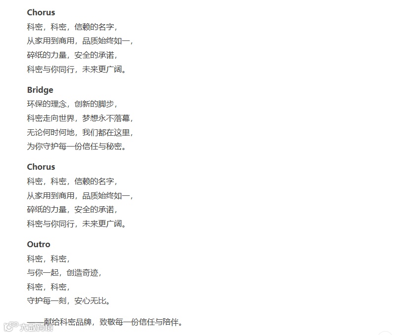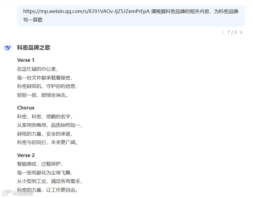 最后,我们请DeepSeek基于对科密碎纸机品牌的了解,为科密品牌写一首歌。它作出了这首《科密品牌之歌》,在此与各位分享: