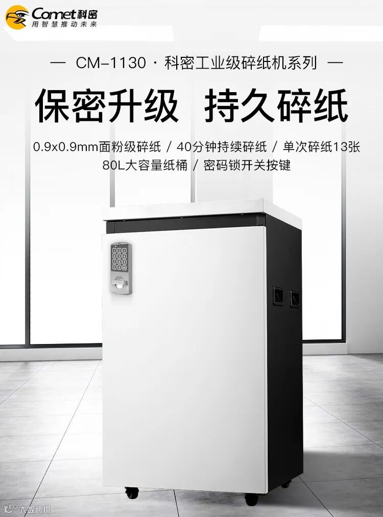 科密碎纸机CM-1130是一款适合大中型办公室内使用,低噪音、易清理、可灵活移动的涉密碎纸机,搭配氮化工艺处理钢刀,碎纸飞速,切割整齐,强力碎纸,不留一丝痕迹,强力销毁秘密文件,保护您的信息安全。