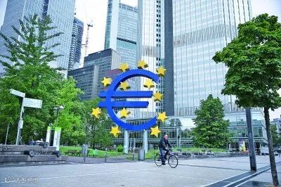7月27日,一名男子骑车经过德国法兰克福的欧元标志。新华社发