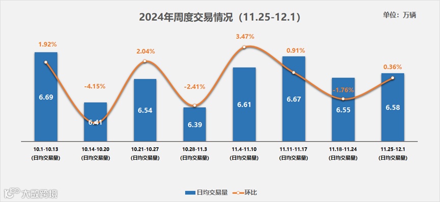 在11月的最后一周,二手车市场呈现出稳健的增长态势,日均交易量达到6.58万辆,与前一周相比微增0.36%,并较10月底的交易量增长了2.9%。这一积极表现得益于汽车置换更新政策的推动和旺季促销活动的助力,使得整个11月的日均交易量稳定在6.5万辆以上。据可比口径计算,11月1日至30日的总交易量预计在175万至178万辆之间,较上月增长了3至5个百分点。