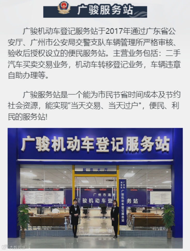 在二手车出口的整个交易环节中广骏机动车登记服务站,可以直接办理二手车出口业务以及车辆的市内过户等业务。