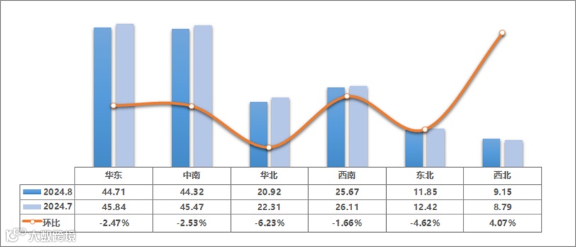 2024年8月,全国六大区中仅西北地区交易量较上月有所增加,其他地区均有不同程度的下滑,其中华北、东北两个地区的降幅相对明显。