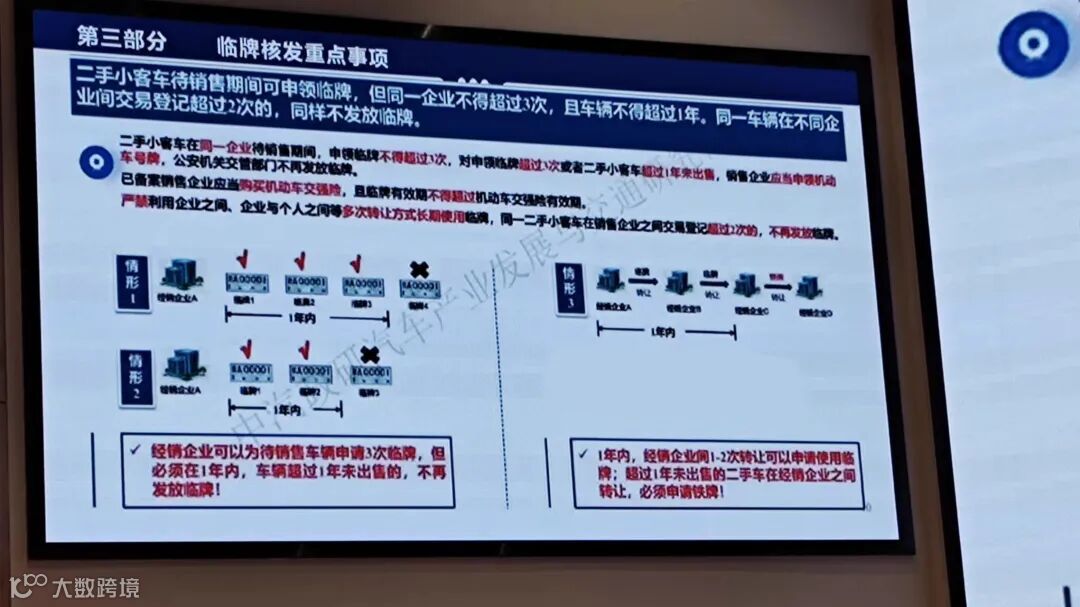 (三)二手小客车待销售期间可申领临牌, 但同一企业不得超过3次, 且车辆不得超过1年。同一车辆在不同企业间交易登记超过2次的,同样不发放临牌。