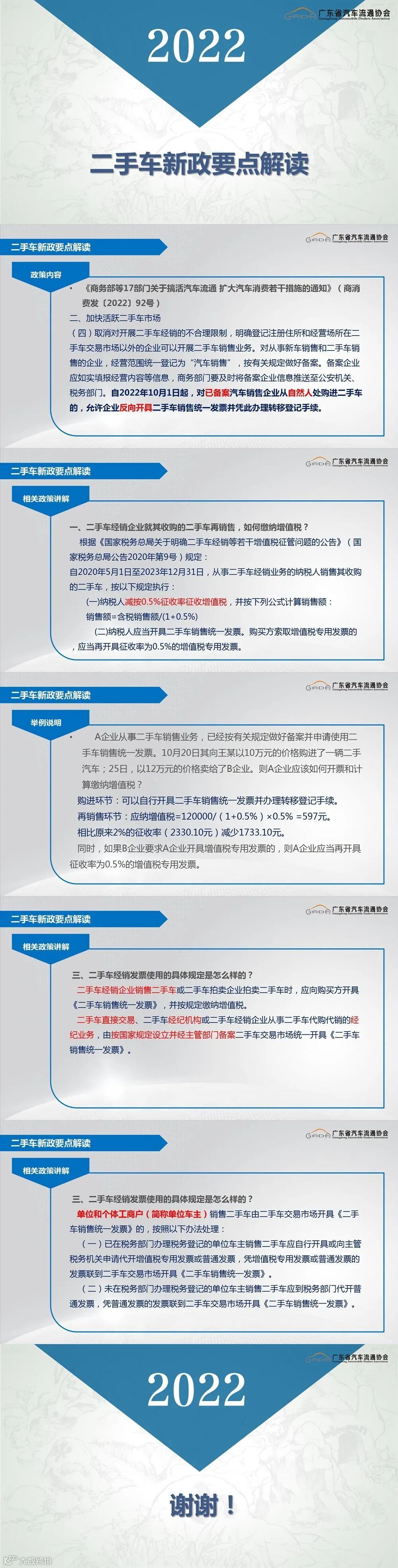 为了更好地帮助会员企业学习理解新政策,协会多次走进会员企业座谈调研,收集企业在落实政策过程中遇到的问题与困难,反馈给政府相关部门,并邀请他们在10月27日“新政策 新格局 新发展”2022广东省二手车大会上做政策解读。