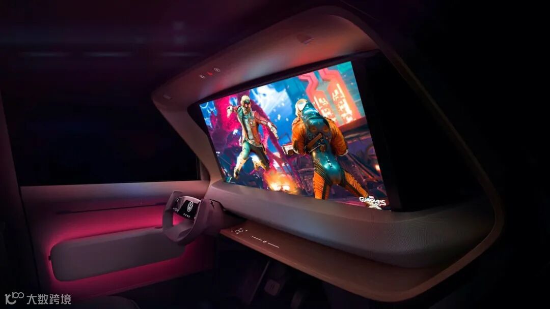 而最让人惊喜的就是ID.LIFE为使用者提供了游戏控制台和可伸缩投影仪,并且都已集成到车辆的多媒体系统中!所以这就意味着可以把你的家用游戏机等其他娱乐设备连接到其中,接着再投射到从仪表板上部延伸的34寸屏幕上,甚至已经覆盖整个挡风玻璃!