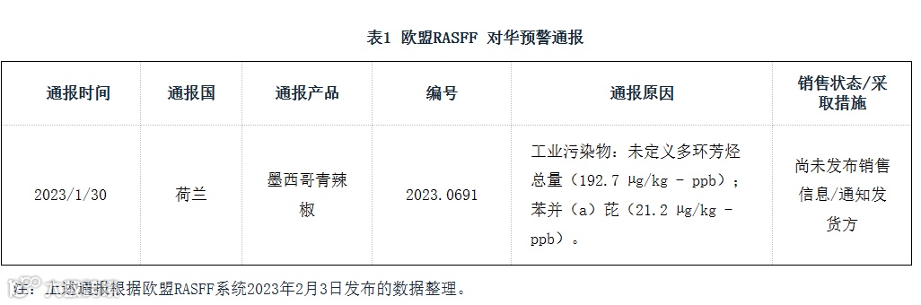 日前,欧盟食品和饲料类快速预警系统(RASFF)发布了2023年第5周通报。共84项,其中,针对中国输欧产品1项(不包括对香港特别行政区和台湾地区的通报),占本期欧盟通报总数的1%。其中,预警通报1项,拒绝入境通报0项,信息通报0项。现将RASFF对华通报摘译如下: