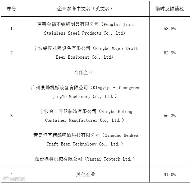 附表:欧盟对华可再装不锈钢桶反倾销初裁征税表