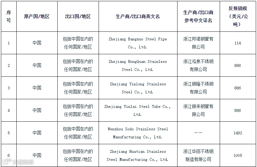 2022年9月23日,印度商工部发布公告,对原产于或进口自中国的直径小于等于6英寸的不锈钢无缝钢管(Stainless-steel Seamless Tubes & Pipes)作出反倾销终裁,建议对中国的涉案产品征收为期5年的反倾销税,税额为0~3801美元/公吨,征税详情见附表(印度对华不锈钢无缝钢管反倾销终裁建议征税表)。涉案产品为无论是采用热挤压工艺或热穿孔工艺制造,无论是作为热加工管或冷加工管售卖,包括缺陷品、非打印品或二级品在内的、公称直径不超过6英寸或与其相当的其他计量单位的不锈钢无缝钢管,涉及印度海关编码7304项下的产品。