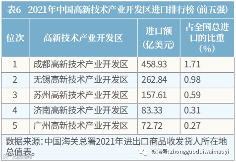 2021年,在统计的65个高新技术产业开发区中,成都高新技术产业开发区的进口规模最大,为459亿美元,占全国总进口的1.71%,占65个高新技术产业开发区进口总额的34.8%。成都高新技术产业开发区的进口规模是排名第5位广州高新技术产业开发区的6.3倍,是排名第10位长沙高新技术产业开发区的23.2倍。2021年,前五大高新技术产业开发区合计进口占全国总进口的3.85%,占65个高新技术产业开发区进口总额的78.4%。与2020年相比,济南高新技术产业开发区排名首次进入前五名,广州高新技术产业开发区排名下降1个位次。