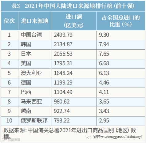 中国台湾是2021年中国大陆第一大进口来源地。2021年,中国大陆第一大进口来源地是中国台湾,中国大陆从中国台湾的进口额达2499.79亿美元,占中国大陆总进口的9.30%。2021年,中国大陆前五大进口来源地分别为中国台湾、韩国、日本、美国和澳大利亚,这五大进口来源地进口合计占中国大陆总进口的份额为37.71%。2020年,前五大进口来源地分别为中国台湾、日本、韩国、美国和澳大利亚,这五大进口来源地合计进口占中国大陆总进口的份额为38.82%。