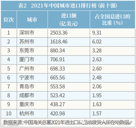 深圳市是2021年我国进口规模排名第一的城市。2021年,深圳市进口规模是2503亿美元,占全国进口总额的9.31%。2021年,前五大进口城市分别依次为深圳市、苏州市、东莞市、厦门市和广州市。2021年和2020年前五大进口城市的排名对比上,厦门市排名上升了2位,首次进入前五;广州市排名下降1位,宁波市排名下降1位,跌出前五。