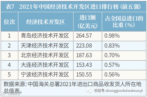 2021年,在统计的85个经济技术开发区中,青岛经济技术开发区的进口规模最大,是265亿美元,占全国总进口的0.98%,占85个经济技术开发区进口总额的15.0%。青岛经济技术开发区的进口规模是排名第10位杭州经济技术开发区的4.5倍,是排名第20位日照经济技术开发区的19倍。2021年,前五大经济技术开发区合计进口占全国总进口的3.64%,占85个经济技术开发区进口总额的55.62%。与2020年相比,青岛经济技术开发区和大连经济技术开发区排名分别上升了1个和2个位次,天津经济技术开发区和广州经济技术开发区排名分别下降了1个和2个位次。