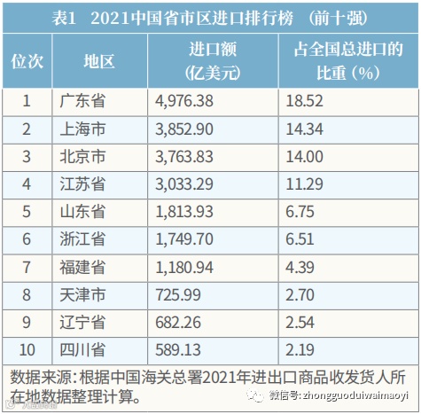 广东省是2021年我国进口规模排名第一的省份。2021年,我国进口规模最多的省份是广东省,进口规模是4976亿美元,占全国进口总额的18.52%。2021年,前五大进口省市分别依次为广东省、上海市、北京市、江苏省和山东省,这五个省市的进口占全国进口的64.9%。2021年前五大进口省份与位次与2020年保持一致。