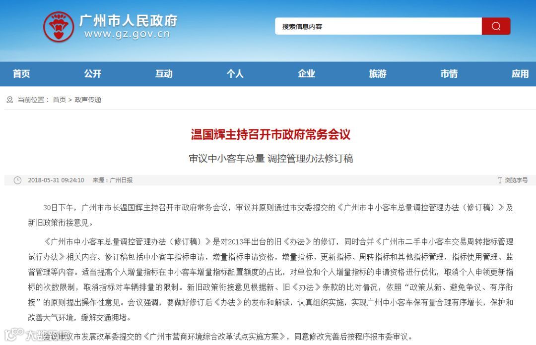 30日下午,广州市市长温国辉主持召开市政府常务会议,审议并原则通过市交委提交的《广州市中小客车总量调控管理办法(修订稿)》及新旧政策衔接意见。