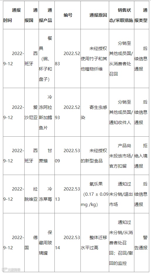 食品伙伴网讯 据欧盟食品饲料类快速预警系统(RASFF)消息,2022年9月12日,欧盟通报我国出口冷冻草莓和甘蔗蜡等产品不合格。具体通报内容如下: