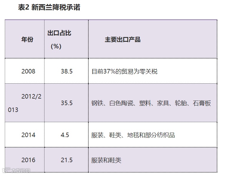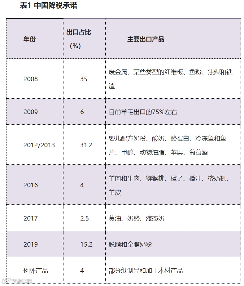 来源:2008年新西兰外交贸易部中新FTA宣传册,出口占比基于基期贸易数据测算