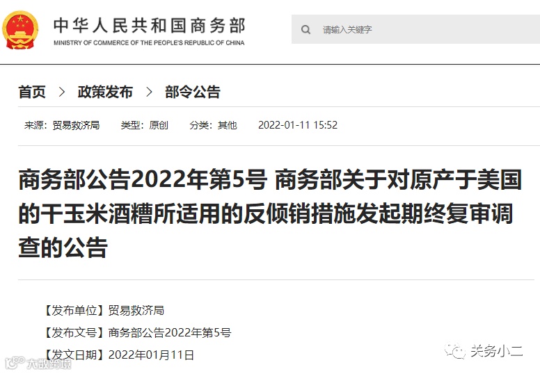 商务部公告2022年第5号 商务部关于对原产于美国的干玉米酒糟所适用的反倾销措施发起期终复审调查的公告