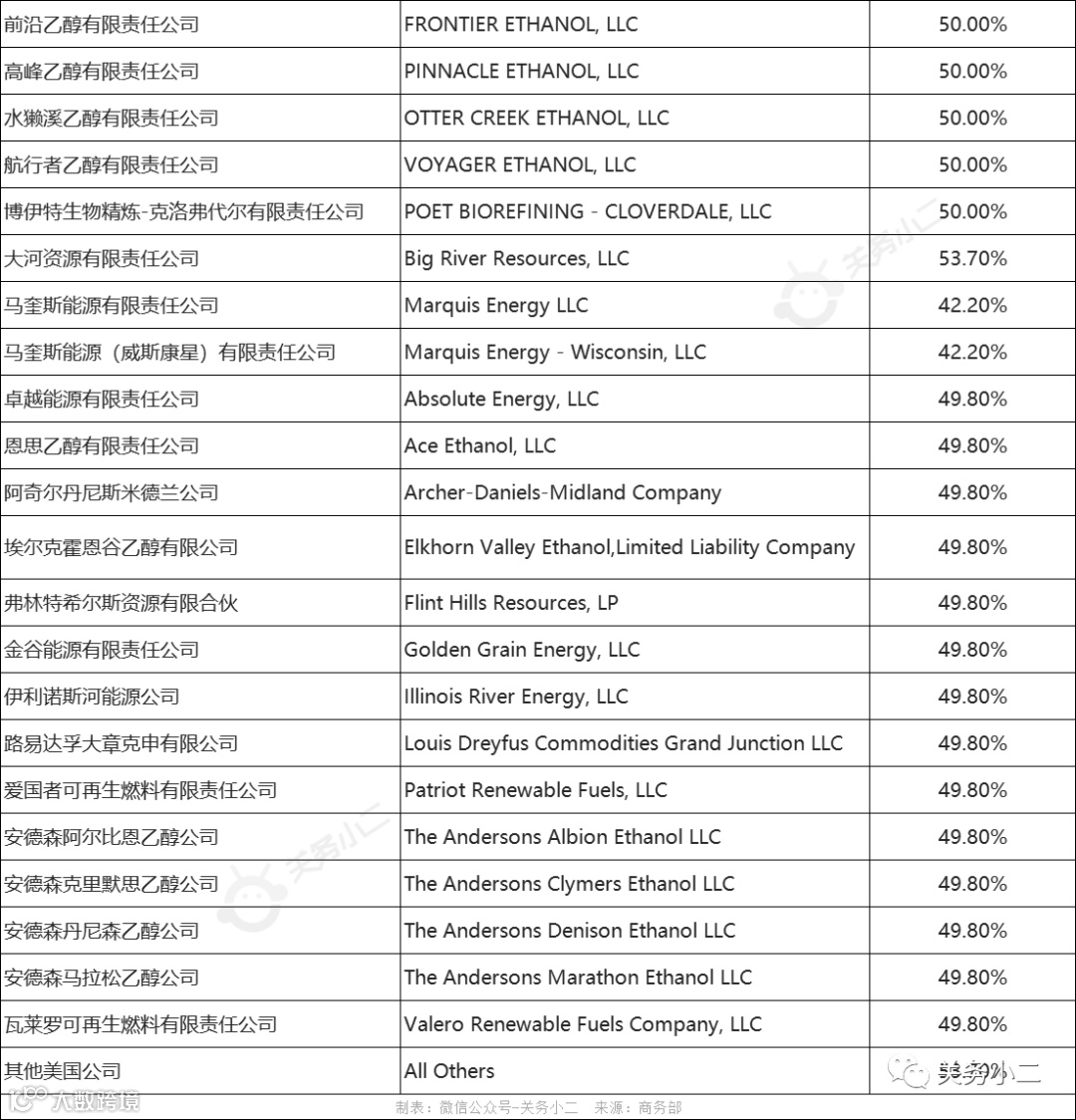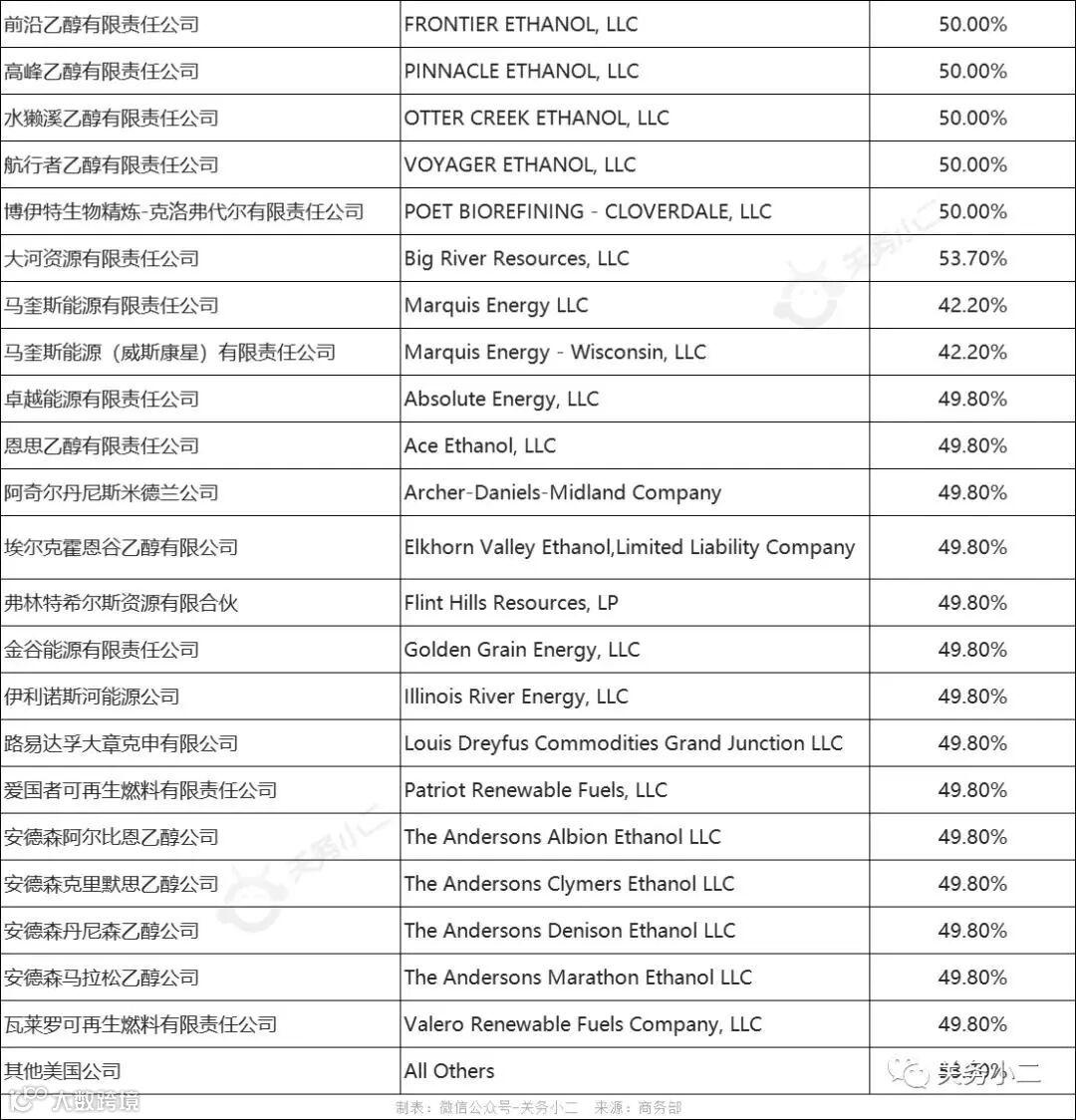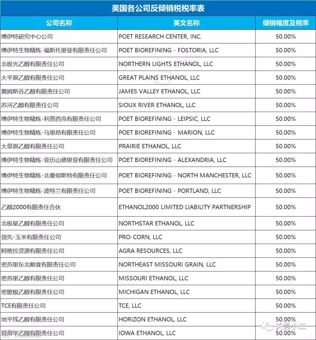 美国各公司反倾销税税率表