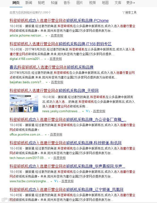 我赶紧上百度搜索科密碎纸机,不得了,这么多网站转载了我们的喜讯。