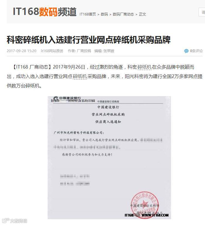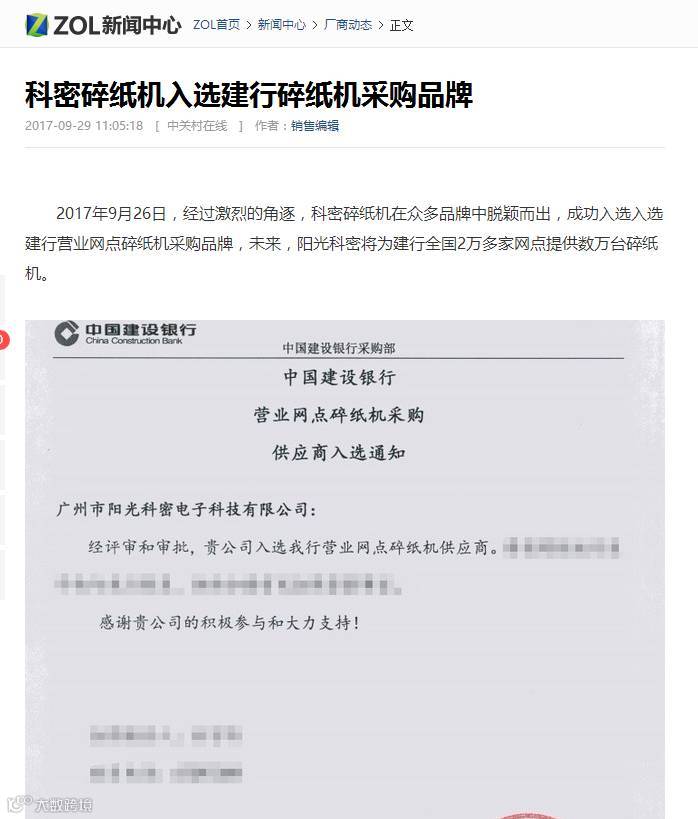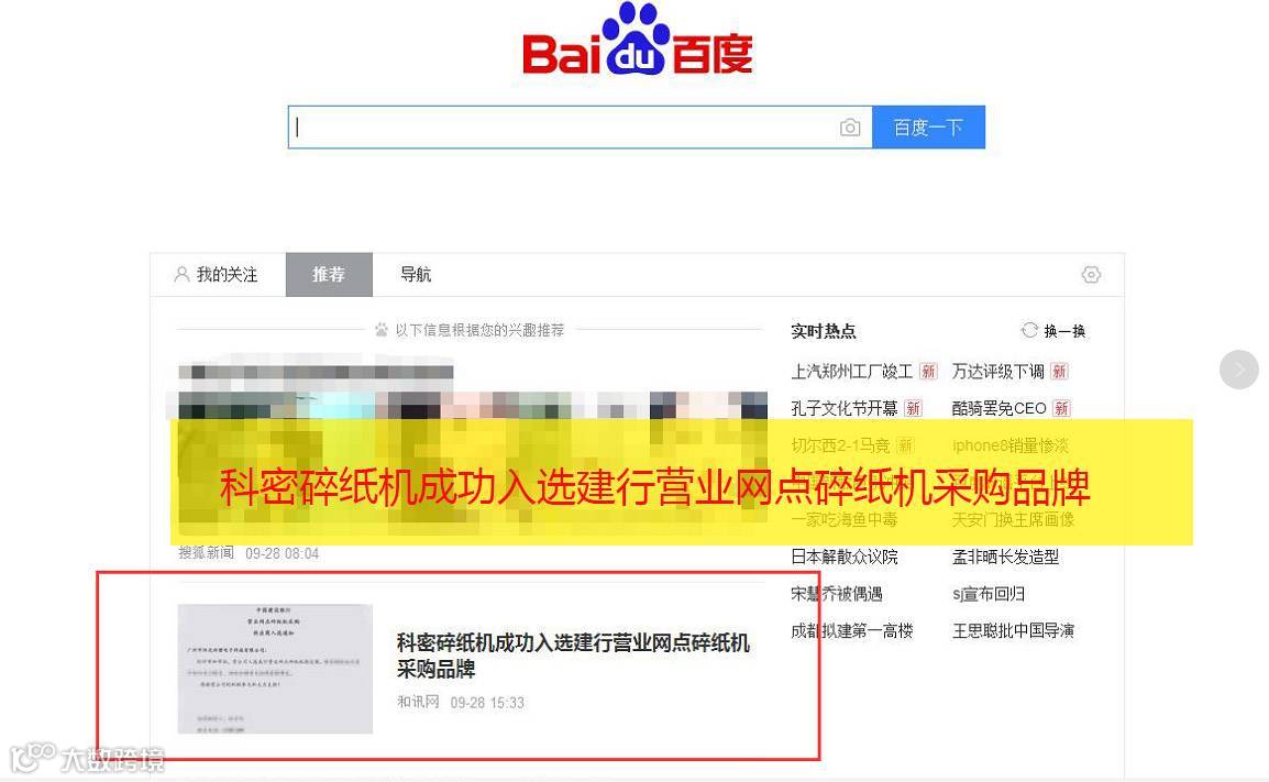 小编今天上着班,想上网查询点资料,打开百度,发现百度首页竟然给我推荐了这样的新闻“科密碎纸机成功入选建行营业网点碎纸机采购品牌”。这不是我们公司昨天才对外公布的喜讯吗。