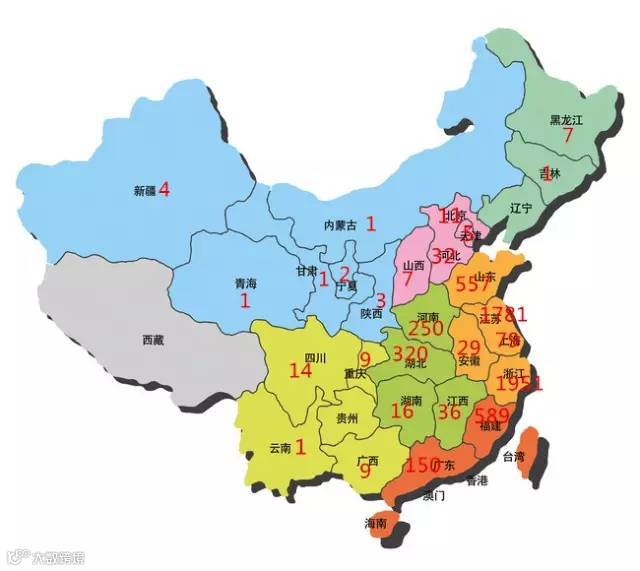 其次是福建589家、山东557家、湖北320家、河南250家、广东150家。