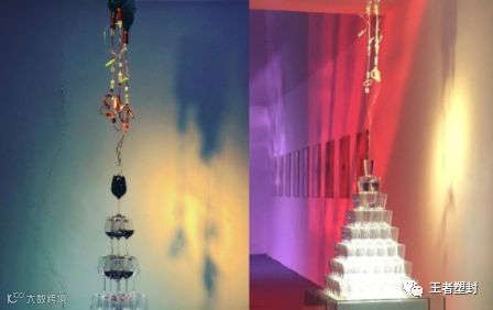 郭强用蒙太奇手法将高脚杯、香槟杯组成的“香槟塔”与红酒、白酒等元素“剪辑”在一起的艺术装置《无题》,制造出一种概念与时空交错的感觉,能够给你带来视觉、嗅觉和味觉等感官不同的感受和体验。作品中的WMF德国福腾宝咖啡杯,使用水晶玻璃材质,耐热抗造,整个杯身晶莹剔透,通透光洁;青苹果水晶玻璃红酒杯,线型流畅,高挑轻盈,天生为品味而生。
