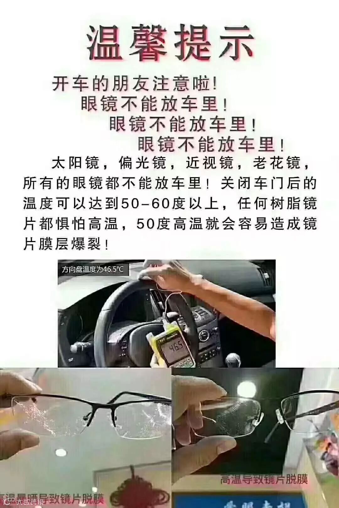 气候越来越热,眼镜不能放在车里哦!由于轿车做的密封越来越好,封闭车门后的温度能够到达70度以上,车内的温度很高,如今的眼镜都是树脂镜片,耐热性不高,长时间高温暴晒就会发黄,变脆,呈现裂缝,基弯变大等。包含太阳镜。