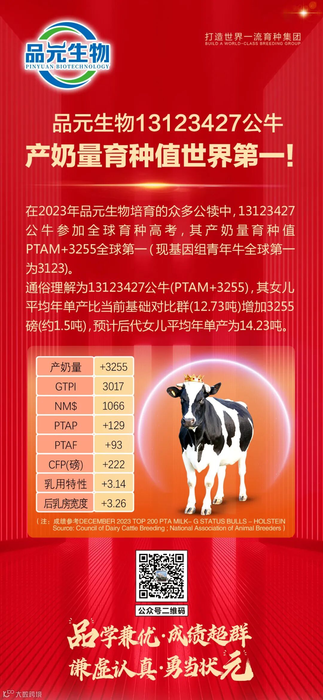 河北品元生物科技有限公司成立于1977年,于2022年成功入选国家种业阵型企业,先后加入美国荷斯坦奶牛协会、国际育种联盟(NAAB)、北方联盟及河北省荷斯坦奶牛种质创新联盟等组织。主要从事奶(肉)牛育种、冻精和胚胎的生产及销售、育种技术服务和进出口业务。品元生物坚持国内国外同步自主育种,充分利用国际资源,加强民族自主育种,致力于培育出国内领先、国际先进的种公牛,打造世界一流育种集团。