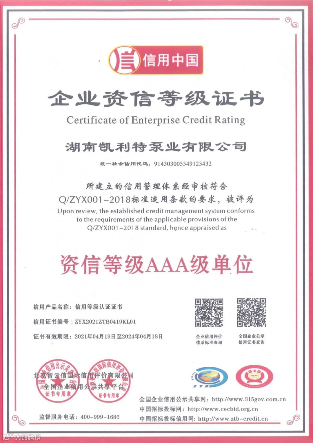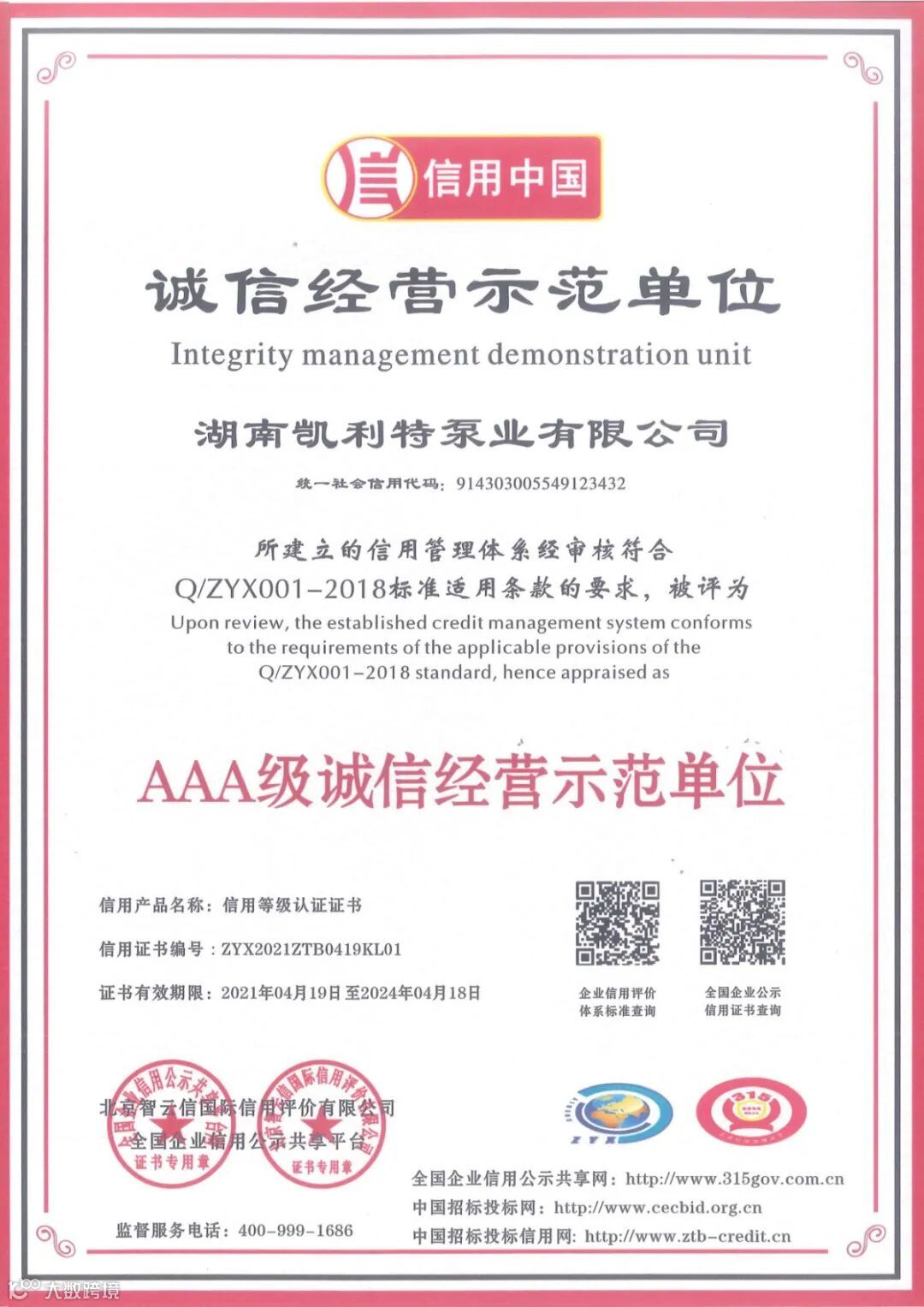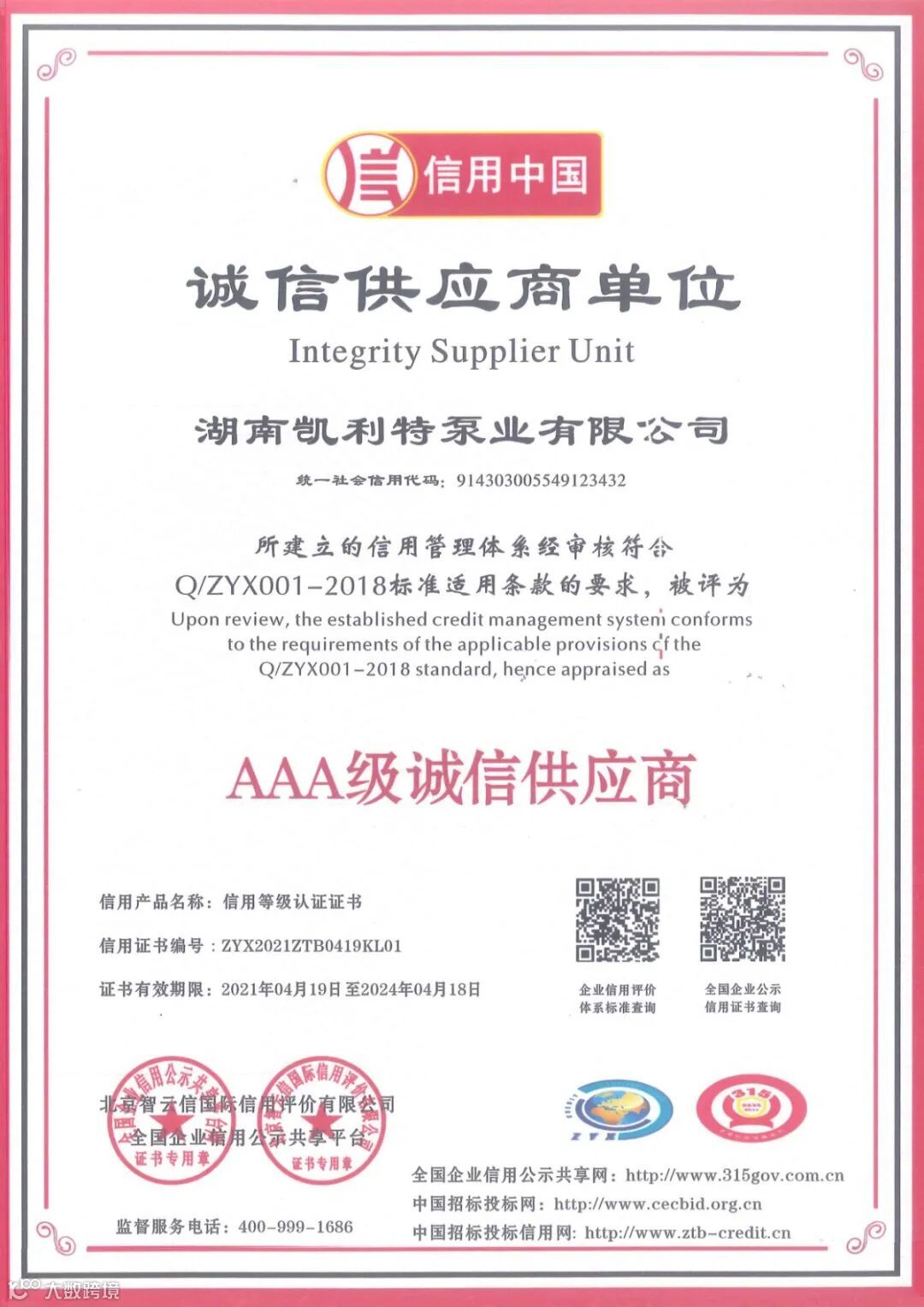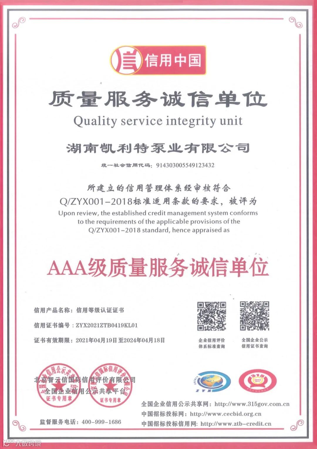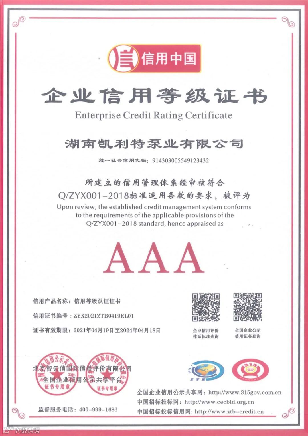 根据全国企业信用公示共享平台及北京智云信国际信用评价有限公司的实地认证考核,特授予湖南凯利特泵业有限公司AAA级重合同守信用单位证书,AAA级企业信用等级证书,AAA级企业资信等级证书,AAA级诚信供应商证书,AAA级诚信经营示范单位证书,AAA级质量服务诚信单位证书。