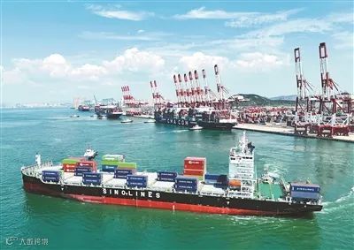 图为一艘货轮缓缓驶离山东港口青岛港。