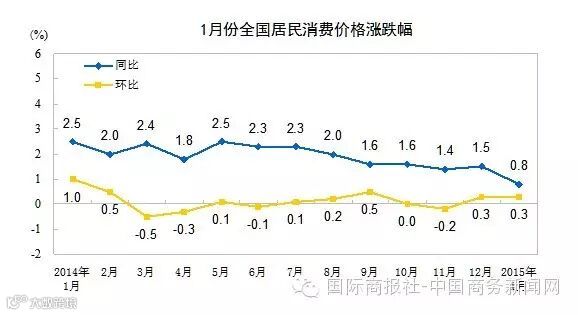2015年1月份,全国居民消费价格总水平同比上涨0.8%。其中,城市上涨0.8%,农村上涨0.6%;食品价格上涨1.1%,非食品价格上涨0.6%;消费品价格上涨0.5%,服务价格上涨1.3%。
