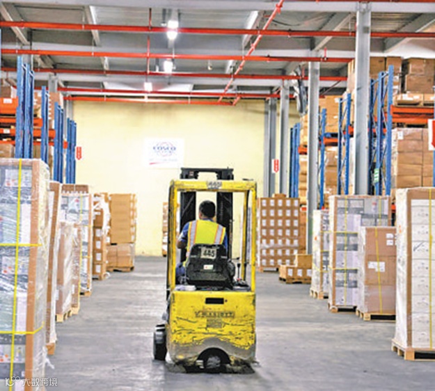 中远海运海外仓内,工作人员正在用叉车搬运货物。