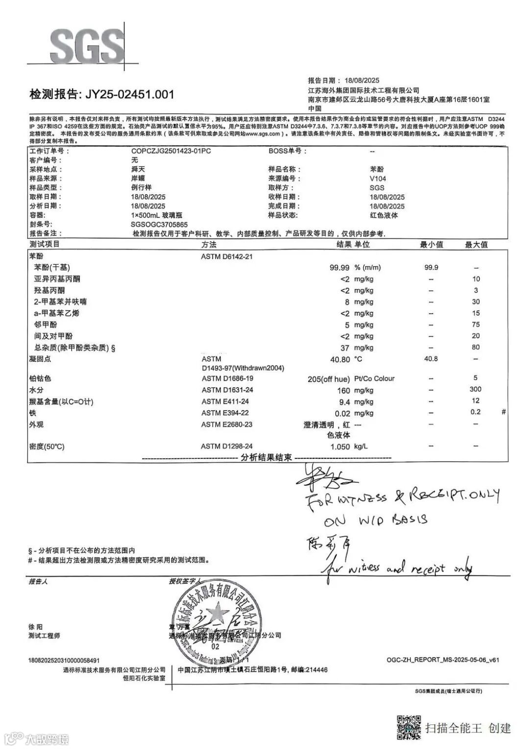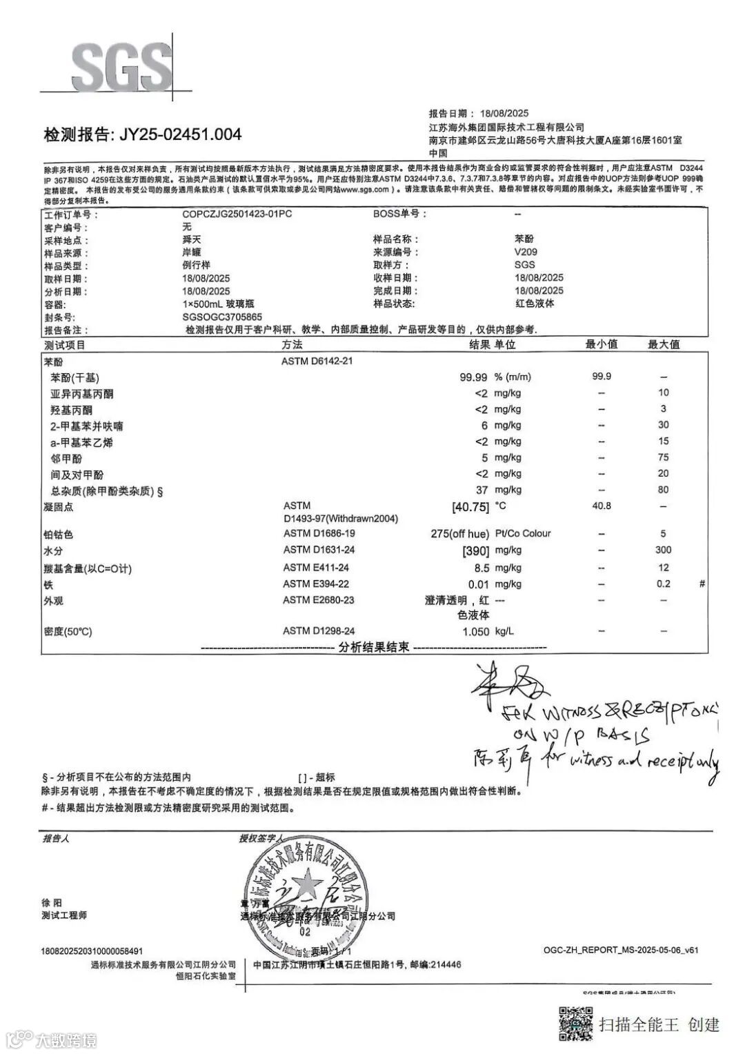 受损原因: 抵达目的港后联检发现苯酚色度不合格