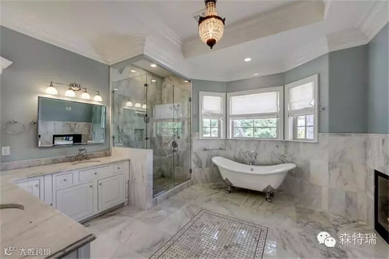 这个焕然一新的浴室瞬间让这个空间满是生命,设计焦点包括对比强烈的长短砖型与不同规格方颗粒搭配搭配,外加订制的洗浴用品、镜子、吊灯特殊罩灯。蓝灰相间的编织外加标志性叠加图案,更化身成整间大厅的主题图样。