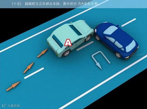 15.超越前方正在掉头车的,图中所示为A车负全责。