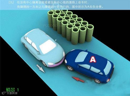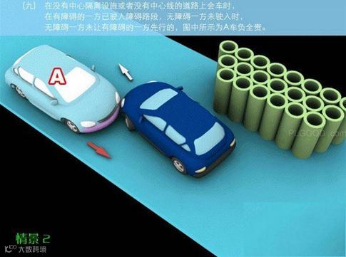 9-2、在没有中心隔离设施或者没有中心线的道路上会车时,在有障碍的一方已驶入障碍路段,无障碍一方未驶入时无障碍一方未让有障碍一方先行的,图中所示为A车负全责