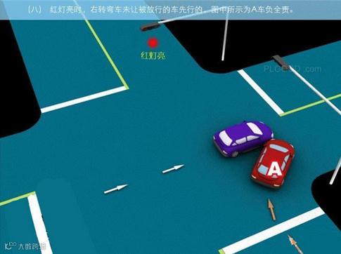 8、红灯亮时,右转弯车未让被放行的车先行的,图中所示为A车负全责。