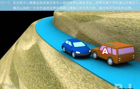 11、在没有中心隔离设施或者没有中心线的狭窄山路会车时,在两车难于同时通过的情况下,靠近山体的一方未作减速或停车等避让措施让对方先行的,图中所示为A车负全责。